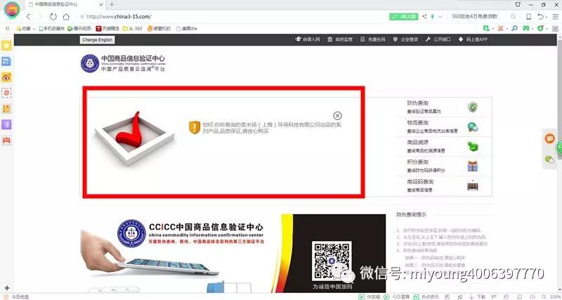 第三步:验证后显示如图3-3,证明验证成功,您购买的确认为米扬原装正品滤芯